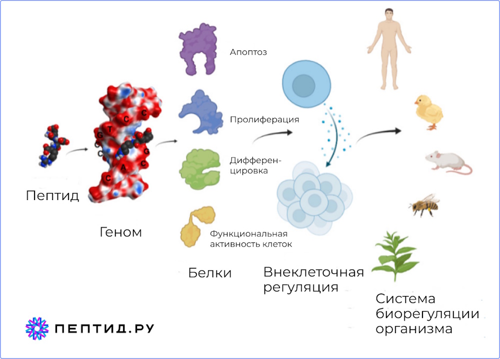 Важно понимать, что пептиды — это не чужеродные вещества. Они образуются естественным путём: когда мы едим белковую пищу, она расщепляется в желудочно-кишечном тракте до ультракоротких пептидов, которые затем всасываются в кровь и начинают свою сигнальную работу. Единый механизм пептидной регуляции экспрессии генов и синтеза белков работает у всех живых организмов — от растений и бактерий до приматов и человека. Физиологическая активность пептидов изучена на 17 видах организмов, что подтверждает универсальность этого механизма.